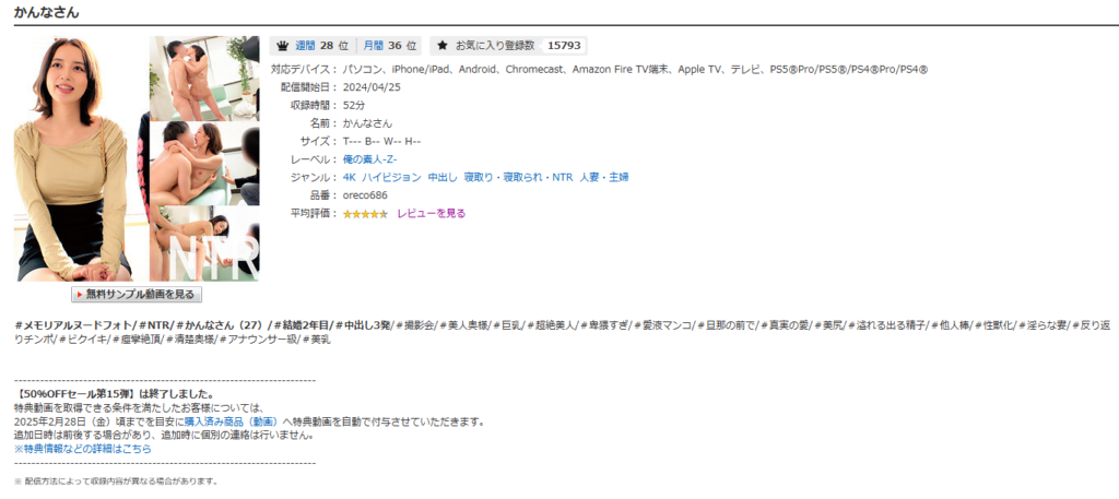 | ジャンル | 4K ハイビジョン 中出し 寝取り・寝取られ・NTR 人妻・主婦 |